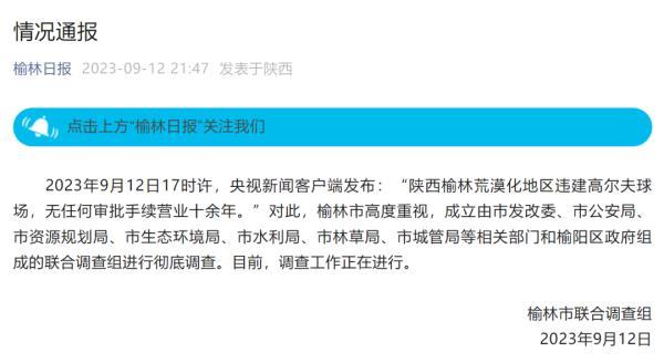 2023年9月12日17時許,央視新聞客戶端發布:“陜西榆林荒漠化地區違建高爾夫球場,無任何審批手續營業十余年。”對此,榆林市高度重視,成立由市發改委、市公安局、市資源規劃局、市生態環境局、市水利局、市林草局、市城管局等相關部門和榆陽區政府組成的聯合調查組進行徹底調查。目前,調查工作正在進行。