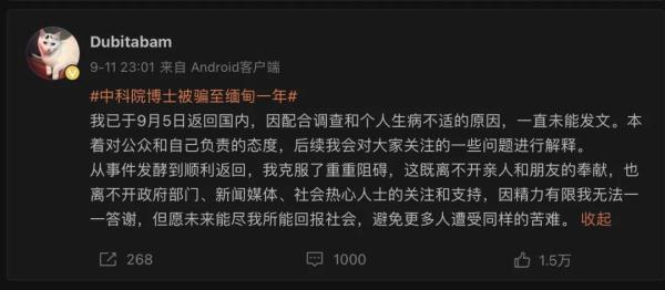 8月,“中科院博士被騙至緬甸”事件引發廣泛關注。9月11日晚,當事人張先生在微博發文表示,他已于9月5日回國,因配合調查和個人生病不適,一直未能發聲。“本著對公眾和自己負責的態度,后續會對大家關注的一些問題進行解釋”。