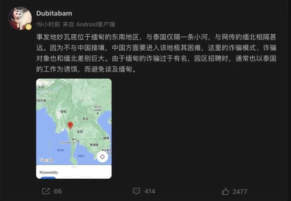 張先生告訴記者,事發地妙瓦底位于緬甸東南部,與泰國僅隔一條小河,與網傳的緬北相隔甚遠。這里的詐騙模式、詐騙對象也和緬北差別巨大。詐騙園區在招聘時,通常也以赴泰國工作為誘餌,避免提及緬甸。