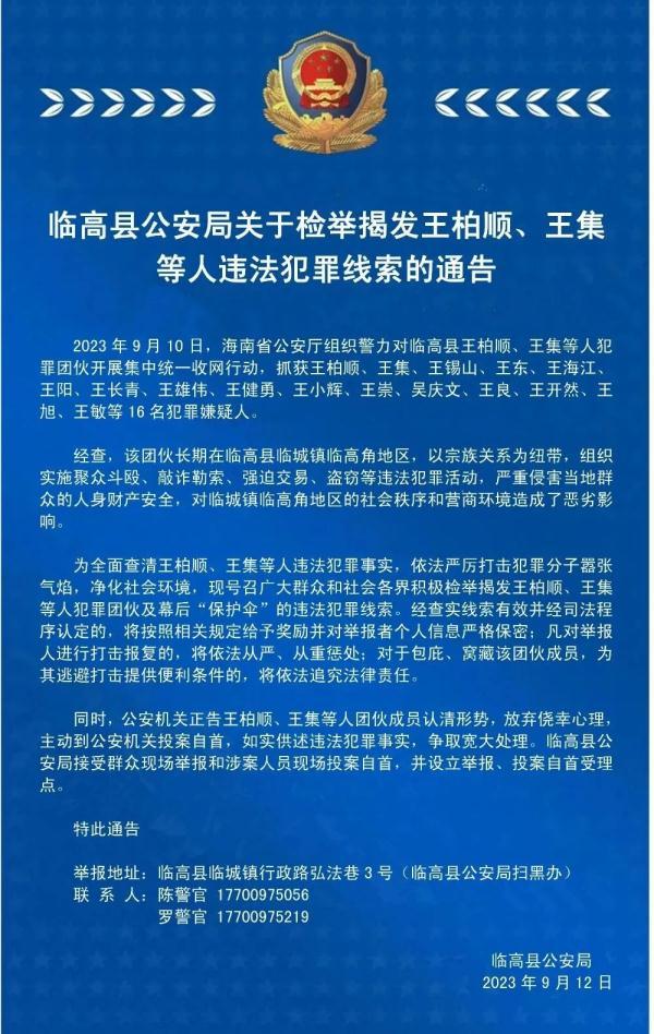 臨高縣公安局關于檢舉揭發王柏順、王集等人違法犯罪線索的通告2023年9月10日,海南省公安廳組織警力對臨高縣王柏順、王集等人犯罪團伙開展集中統一收網行動,抓獲王柏順、王集、王錫山、王東、王海江、王陽、王長青、王雄偉、王健勇、王小輝、王崇、吳慶文、王良、王開然、王旭、王敏等16名犯罪嫌疑人。經查,該團伙長期在臨高縣臨城鎮臨高角地區,以宗族關系為紐帶,組織實施聚眾斗毆、敲詐勒索、強迫交易、盜竊等違法犯罪活動,嚴重侵害當地群眾的人身財產安全,對臨城鎮臨高角地區的社會秩序和營商環境造成了惡劣影響。為全面查清王柏順、王集等人違法犯罪事實,依法嚴厲打擊犯罪分子囂張氣焰,凈化社會環境,現號召廣大群眾和社會各界積極檢舉揭發王柏順、王集等人犯罪團伙及幕后“保護傘”的違法犯罪線索。經查實線索有效并經司法程序認定的,將按照相關規定給予獎勵并對舉報者個人信息嚴格保密;凡對舉報人進行打擊報復的,將依法從嚴、從重懲處;對于包庇、窩藏該團伙成員,為其逃避打擊提供便利條件的,將依法追究法律責任。同時,公安機關正告王柏順、王集等人團伙成員認清形勢,放棄僥幸心理,主動到公安機關投案自首,如實供述違法犯罪事實,爭取寬大處理。臨高縣公安局接受群眾現場舉報和涉案人員現場投案自首,并設立舉報、投案自首受理點。特此通告舉報地址:臨高縣臨城鎮行政路弘法巷3號(臨高縣公安局掃黑辦)聯系人:陳警官 17700975056羅警官 17700975219臨高縣公安局2023年9月12日轉自:臨高警方來源:國際旅游島商報