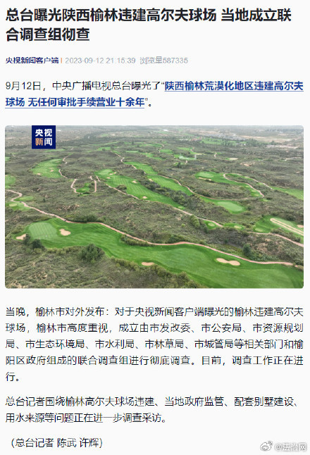 9月12日,中央廣播電視總臺曝光了“陜西榆林荒漠化地區違建高爾夫球場 無任何審批手續營業十余年”。當晚,榆林市對外發布:對于央視新聞客戶端曝光的榆林違建高爾夫球場,榆林市高度重視,成立由市發改委、市公安局、市資源規劃局、市生態環境局、市水利局、市林草局、市城管局等相關部門和榆陽區政府組成的聯合調查組進行徹底調查。目前,調查工作正在進行。(央視新聞客戶端)