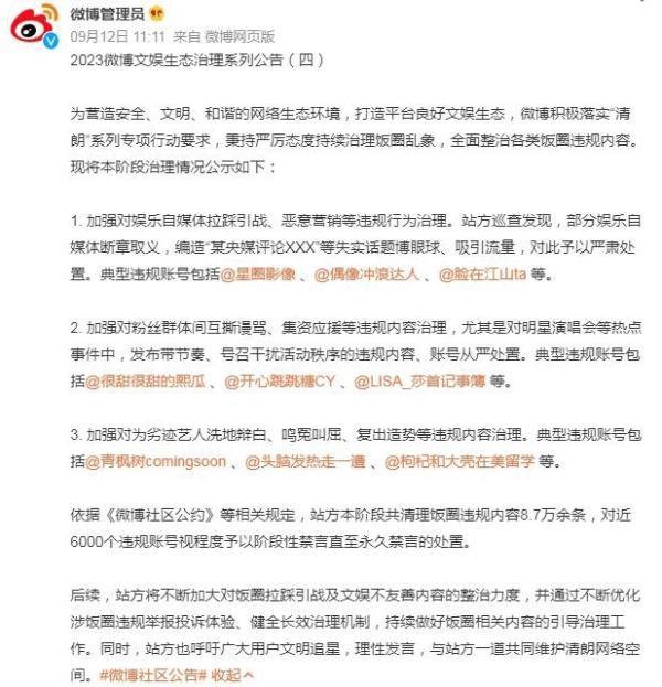 依據《微博社區公約》等相關規定,站方本階段共清理飯圈違規內容8.7萬余條,對近6000個違規賬號視程度予以階段性禁言直至永久禁言的處置。