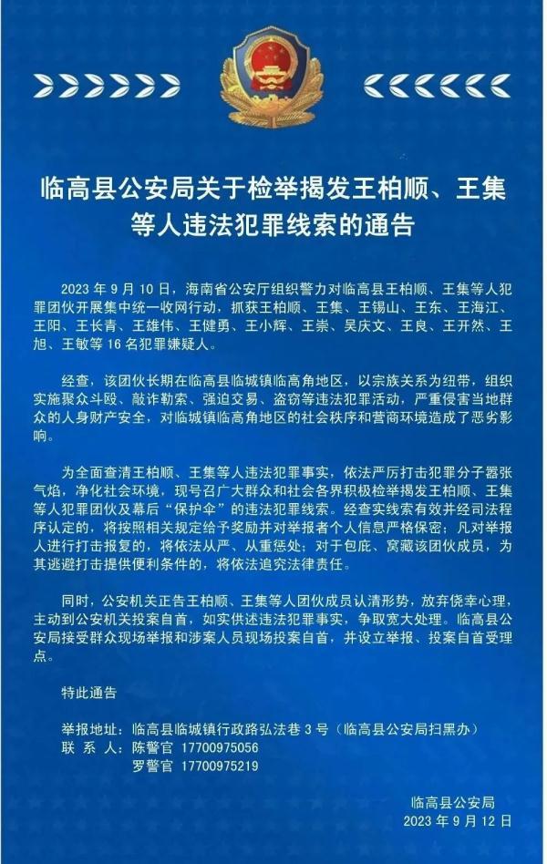2023年9月10日,海南省公安廳組織警力對臨高縣王柏順、王集等人犯罪團伙開展集中統一收網行動,抓獲王柏順、王集、王錫山、王東、王海江、王陽、王長青、王雄偉、王健勇、王小輝、王崇、吳慶文、王良、王開然、王旭、王敏等16名犯罪嫌疑人。