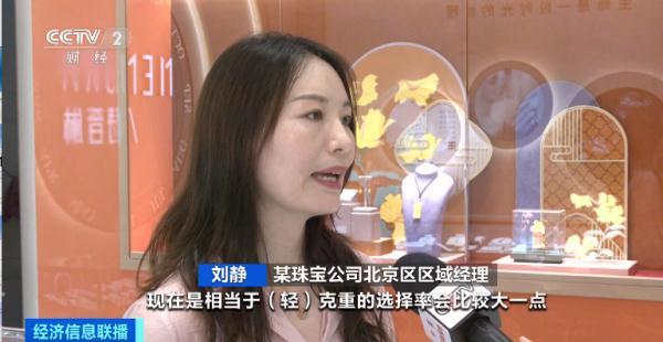 某珠寶公司北京區區域經理 劉靜:購買黃金飾品的人較去年同期增加至少三倍,現在輕克重的選擇率較大,消費者選擇的款式和風格也偏多。
