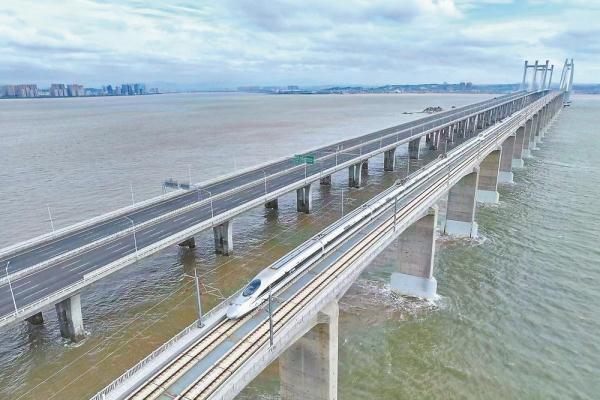 安海灣特大橋自身“大跨”“跨海”的屬性,讓無砟軌道上橋極具挑戰。經過反復模擬試驗,設計團隊找到了適應“大跨”“跨海”條件的鋼混結合梁結構參數,采用全聯長鋼混結合梁,主梁采用有效氣動措施,滿足了跨海大橋通行高鐵列車的技術要求;橋面鋪設擁有自主知識產權的CRTSⅠ型雙塊式無砟軌道,實現時速350公里高鐵列車跨海過橋不減速。通車之后,時速350公里的高鐵列車駛過650米長的主橋用時不到7秒,跨過整個海域也只需98秒。