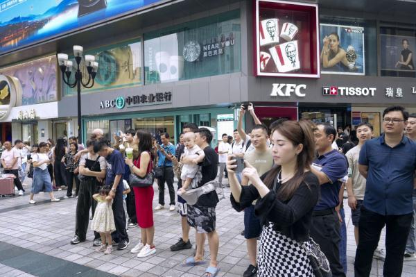 9月13日,重慶市渝中區解放碑商業步行街的活動現場,市民們在駐足觀看主題快閃舞蹈。
