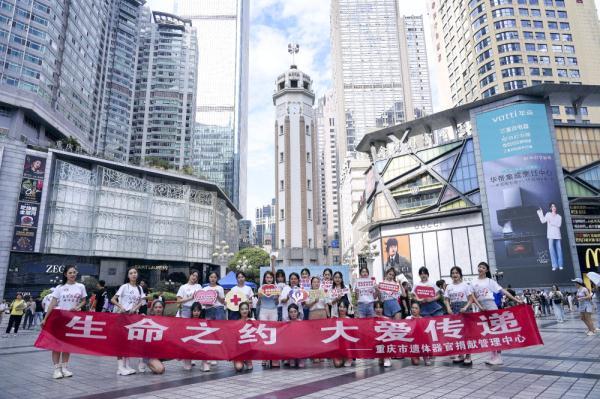 9月13日,“生命之約·大愛傳遞”人體器官捐獻宣傳季活動現場,紅十字會志愿者們在解放碑商業步行街的標志建筑前合影。