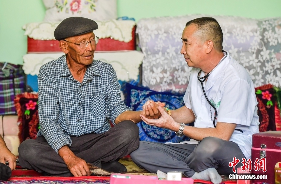 鄉村醫生谷平為牧民把脈問診。中新社記者 劉新 攝