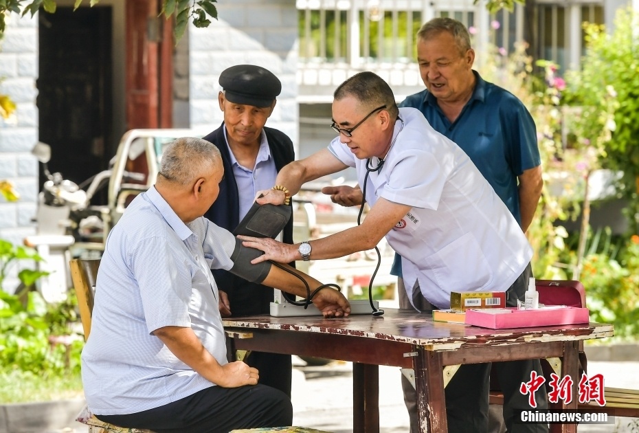 鄉村醫生谷平在院落里為牧民測量血壓。中新社記者 劉新 攝