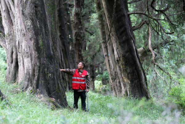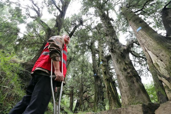 為了近距離觀察,付兆倫拄著單拐爬坡下坎。“每天有近2個小時的巡護,只要抬眼看到參天的古柏,我就有了動力。”