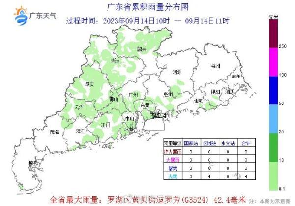今日(14日),廣東雨水仍在持續。據廣東氣象部門,今日10時-11時,廣東全省最大雨量出現在深圳羅湖,錄得雨量42.4毫米。