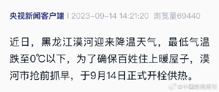 近日,黑龍江漠河迎來降溫天氣,最低氣溫跌至0℃以下,為了確保百姓住上暖屋子,漠河市于9月14日正式開栓供熱。漠河地處中國最北端,冬季漫長寒冷,全年平均氣溫約-3.5℃。據了解,今年漠河市比計劃開栓時間提前11天,供暖時間將持續到明年5月中旬,是全國較早供暖的地區之一。(央視新聞)