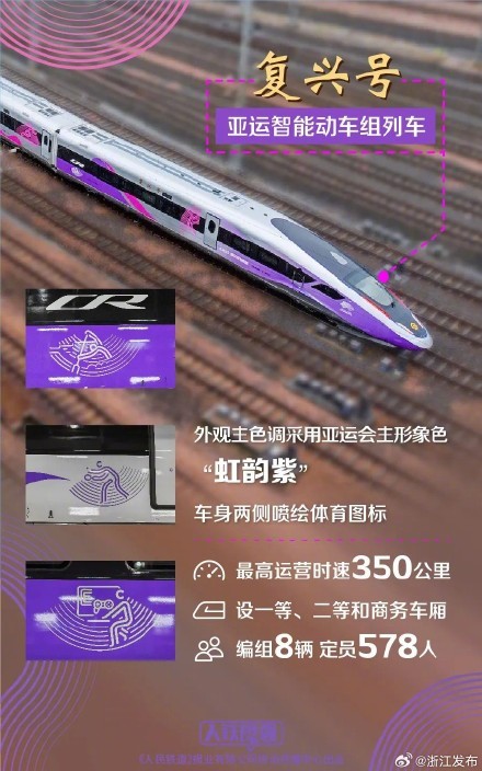 杭州第19屆亞運會復興號亞運智能動車組列車是專為杭州亞運會打造的,車頭似“鷹隼”,身披“虹韻紫”,8輛編組,定員578人,設計時速350公里。按照亞運服務保障計劃,復興號亞運智能動車組列車9月16日起,在杭州東至衢州以及杭州東至平陽兩個區段運行。