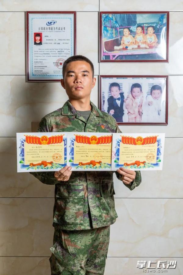 “其實,我們三胞胎兄弟中最先參軍的是老三張偉業,他是去年上半年在湖南汽車工程職業學院念大一時入伍的。老二張偉杰看到弟弟‘搶先’入伍,就迫不及待地在去年下半年參軍了,當時他在湖南勞動人事職業學院念完了大二。”張偉英笑著向記者解釋。
