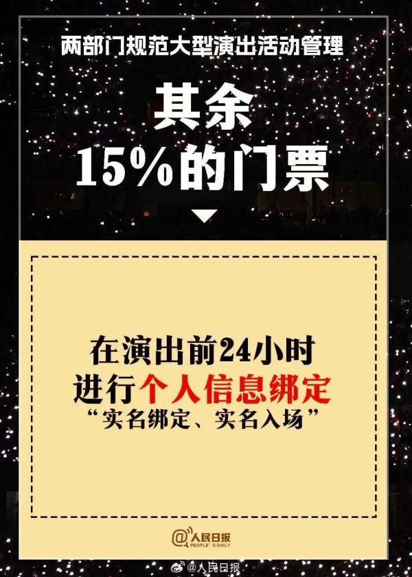 其中最抓眼球的一條,就是——“演出舉辦單位公開銷售的門票數量,不得低于核準觀眾數量的85%;對其余15%的門票,應當在演出前24小時進行個人信息綁定,做到‘實名綁定、實名入場’。”