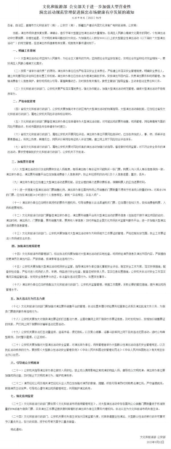 9月13日,文化和旅游部在其官網發布了名為《文化和旅游部 公安部關于進一步加強大型營業性演出活動規范管理促進演出市場健康有序發展的通知》(以下簡稱《通知》)一文。
