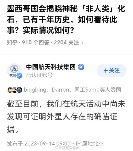 9月14日,中國航天科技集團官方賬號在知乎回答有關墨西哥兩具疑似“外星生物”遺骸亮相的提問稱,“截至目前,我們在航天活動中尚未發現可證明外星人存在的確鑿證據?!?/p>