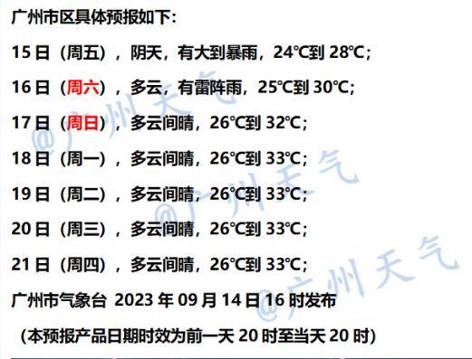 廣州9月14日-16日受高空槽、切變線影響,有大到暴雨,并伴有雷電、短時強降水等強對流天氣,氣溫略下降;