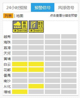 截至17時30分,廣州氣象臺發布暴雨黃色預警信號和雷雨大風黃色信號