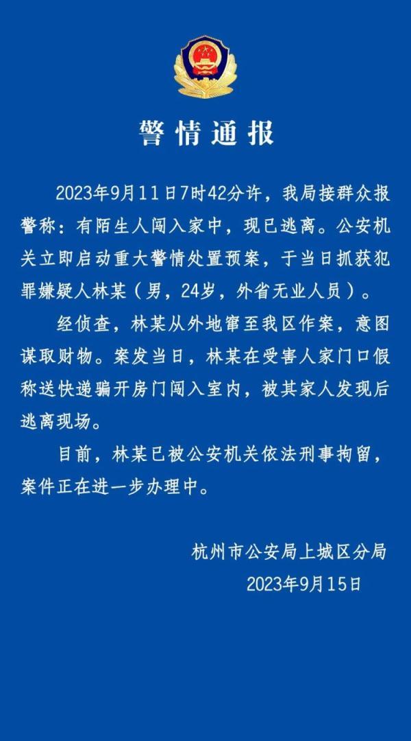 2023年9月11日7時(shí)42分許,我局接群眾報(bào)警稱:有陌生人闖入家中,現(xiàn)已逃離。公安機(jī)關(guān)立即啟動重大警情處置預(yù)案,于當(dāng)日抓獲犯罪嫌疑人林某(男,24歲,外省無業(yè)人員)。