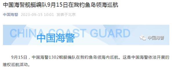 據“中國海警”微信公眾號消息,9月15日,中國海警1302艦艇編隊在我釣魚島領海內巡航。這是中國海警依法開展的維權巡航活動。