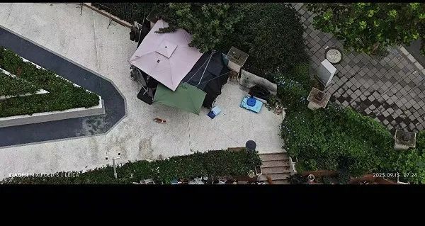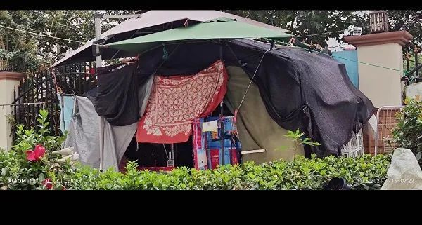 9月13日下午,記者走進(jìn)普陀區(qū)普雄路26弄普雄馨苑小區(qū)。很快,便“順著氣味”,在靠近17號(hào)居民樓附近的綠化帶內(nèi),發(fā)現(xiàn)了這處“貓舍”。“貓舍”體量不小,據(jù)目測(cè),至少有將近2米長(zhǎng),近半米寬,大半個(gè)“身子”探進(jìn)綠化帶里,并且占去了不少綠植,貓舍有兩把較大的遮雨傘作為“支撐”,四周也被遮雨布給圍擋起來。向里張望,除了能發(fā)現(xiàn)幾只“小家伙”的身影,還能夠看到用來給流浪貓喂食的器皿等等。現(xiàn)場(chǎng)始終散發(fā)著一股難以名狀的騷臭味,記者穿著中褲,小腿肚部位不時(shí)傳來陣陣瘙癢。