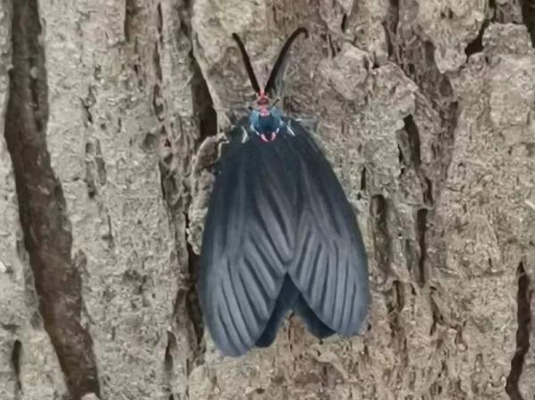 重陽木錦斑蛾成蟲的外形體長2.5厘米左右,有兩根黑色的觸角,身體為紅色,翅膀為黑色。