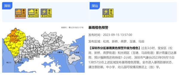 過去3小時,寶安區(松崗、新橋、燕羅街道)和光明區(玉塘、馬田街道)累計雨量已達暴雨,預計強降雨還將持續1-2小時,深圳市氣象臺2023年09月15日13時57分在上述區域發布暴雨橙色預警。
