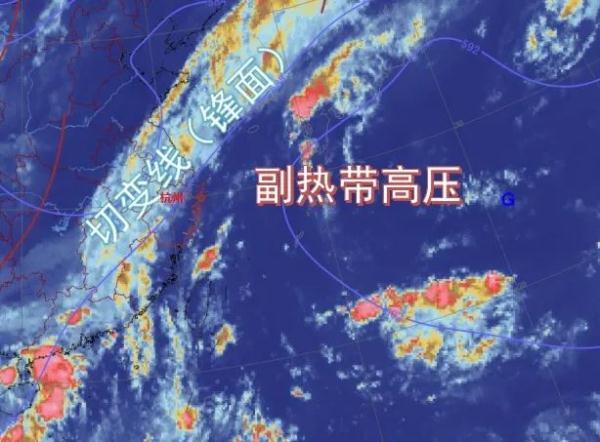 冷暖氣流相互對峙,在江南形成狹長了東北-西南向雨帶。