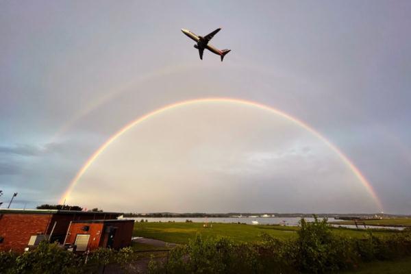 2022年5月15日,在美國弗吉尼亞州阿靈頓,一架飛機從暴雨過后的雙彩虹旁飛過。新華社記者劉杰攝
