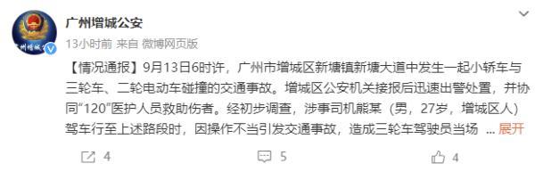據通報,9月13日6時許,廣州市增城區新塘鎮新塘大道中發生一起小轎車與三輪車、二輪電動車碰撞的交通事故。增城區公安機關接報后迅速出警處置,并協同“120”醫護人員救助傷者。