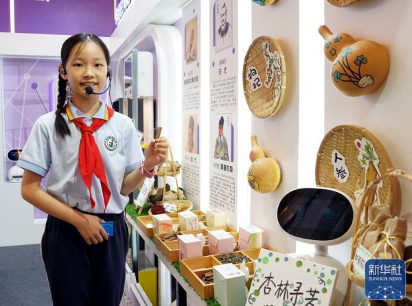 ↑9月15日,浦東新區張江高科實驗小學的學生在展會上介紹在國粹傳習特色課程中學習的中草藥知識。