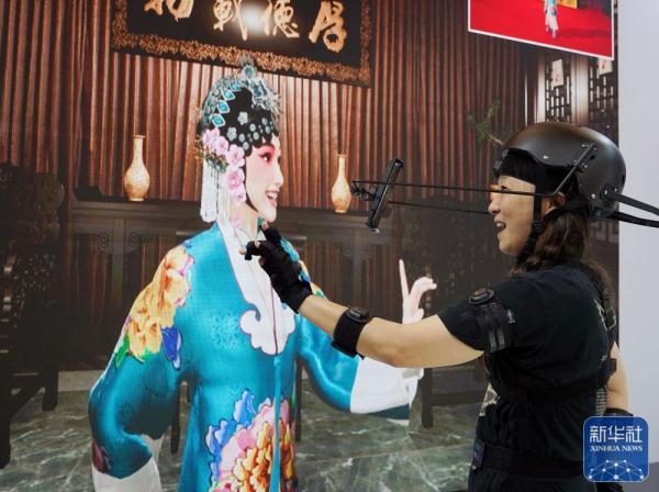 ↑9月15日,在上海工藝美術職業學院展臺,工作人員展示“適配真人中國傳統戲曲仿真表演系統研發”項目,即采用數字虛擬人技術呈現中國傳統戲曲表演。