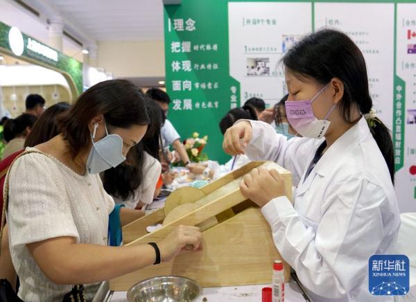 ↑9月15日,觀眾在上海市醫藥學校展臺了解手工制作的艾條。