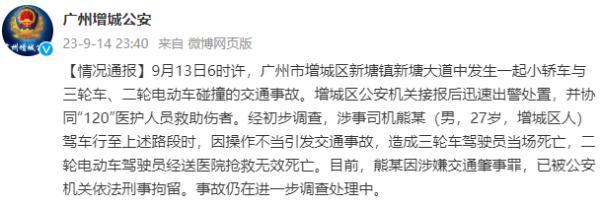 經初步調查,涉事司機熊某(男,27歲,增城區人)駕車行至上述路段時,因操作不當引發交通事故,造成三輪車駕駛員當場死亡,二輪電動車駕駛員經送醫院搶救無效死亡。
