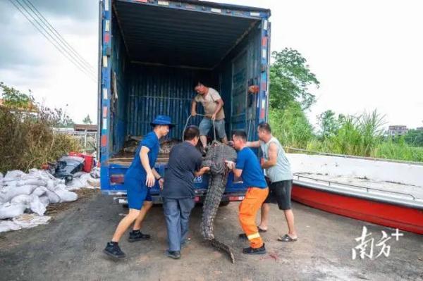 在茂名市茂南區(qū)一鱷魚養(yǎng)殖場旁,眾人抬起一條鱷魚,有的托著頭,有的拉著前肢,一齊往貨車上放置。這條鱷魚嘴部和四肢被緊緊捆綁著,完全沒有反抗的余地。