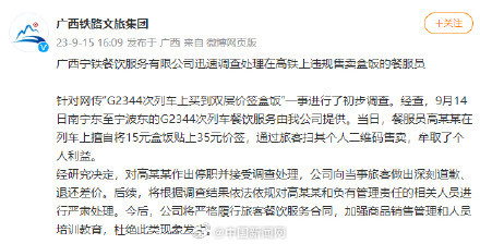 針對網傳“G2344次列車上買到雙層價簽盒飯”一事進行了初步調查。經查,9月14日南寧東至寧波東的G2344次列車餐飲服務由我公司提供。當日,餐服員高某某在列車上擅自將15元盒飯貼上35元價簽,通過旅客掃其個人二維碼售賣,牟取了個人利益。