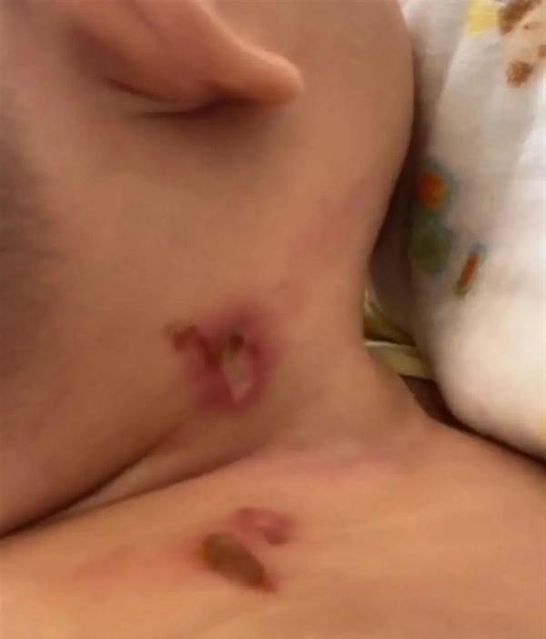 事發后第三天,黃女士在網上求助,“誰有沒有好一點辦法,讓孩子脖子和肩膀上的肉能隔離,摩擦很容易裂開、流膿。被燙傷三天了,孩子都要抱著睡,我好害怕,心都碎了。”