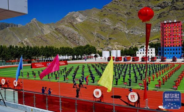 ↑ 9月15日拍攝的西藏第二屆消防行業(yè)職業(yè)技能大賽暨“雪域藍焰 珠峰對決”實戰(zhàn)化大練兵比武競賽開幕式。