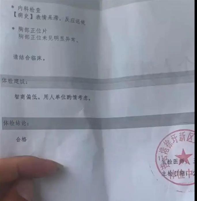 9月12日,有網友發布一則體檢報告視頻,內科檢查一欄寫著“(病史)表情呆滯,反應遲鈍”字樣,而在體檢建議一欄則寫著“智商偏低。用人單位酌情考慮”的內容,而在胸部拍片一欄則完全正常,最終的體檢結論也是合格。