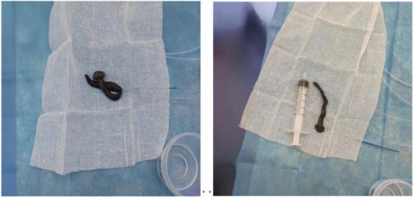 螞蟥身上長有吸盤,可以很緊密地吸附在氣管壁上,如果直接用鉗子生拉硬扯,會損傷患者的氣道引起氣管粘膜損傷等并發癥,若不慎把螞蟥扯斷吸盤還殘留在體內徒增二次手術。在醫務人員默契協作下,通過全麻無痛支氣管鏡完全將螞蟥取了出來,經測量這條螞蟥體長約8cm。螞蟥取出后,韋某咳嗽、咳痰、痰中帶血及喉間異物感消失,很快就恢復正常,精神狀態良好,目前已恢復健康并出院。