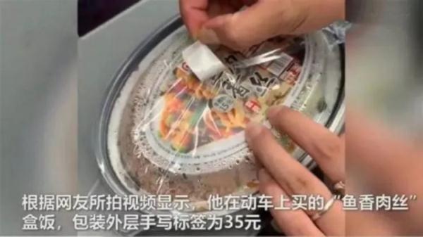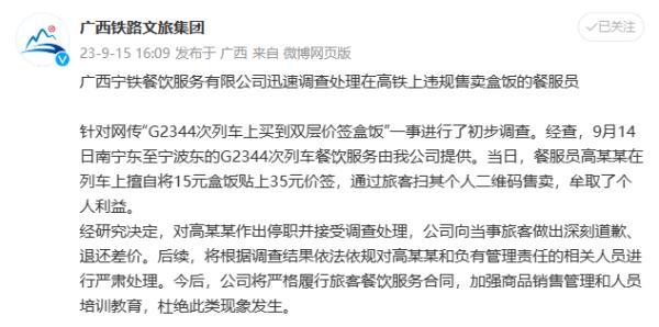 經查,9月14日南寧東至寧波東的G2344次列車餐飲服務由我公司提供。當日,餐服員高某某在列車上擅自將15元盒飯貼上35元價簽,通過旅客掃其個人二維碼售賣,牟取了個人利益 。