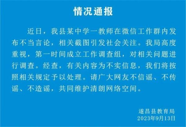 近日,我縣某中學一教師在微信工作群內發布不當言論,相關截圖引發社會關注。我局高度重視,第一時間成立工作調查組,對相關問題進行調查。經查,有關內容為不實信息,我們將按照相關規定予以處理。請廣大網友不信謠、不傳謠、不造謠,共同維護清朗網絡空間。