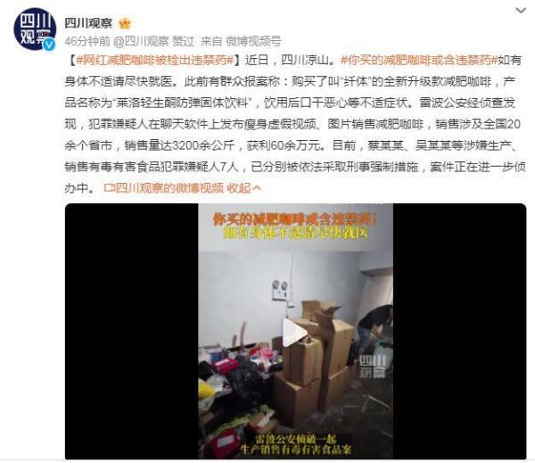 你買的減肥咖啡或含違禁藥,如有身體不適請盡快就醫。此前有群眾報案稱:購買了叫“纖體”的全新升級款減肥咖啡,產品名稱為“萊洛輕生酮防彈固體飲料”,飲用后口干惡心等不適癥狀。雷波公安經偵查發現,犯罪嫌疑人在聊天軟件上發布瘦身虛假視頻、圖片銷售減肥咖啡,銷售涉及全國20余個省市,銷售量達3200余公斤,獲利60余萬元。目前,蔡某某、吳某某等涉嫌生產、銷售有毒有害食品犯罪嫌疑人7人,已分別被依法采取刑事強制措施,案件正在進一步偵辦中。