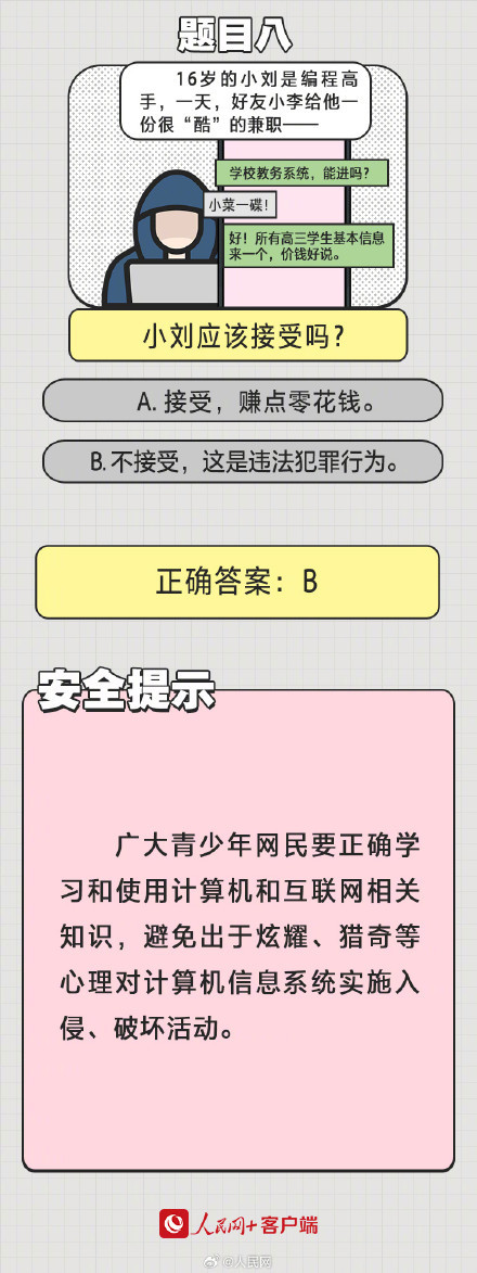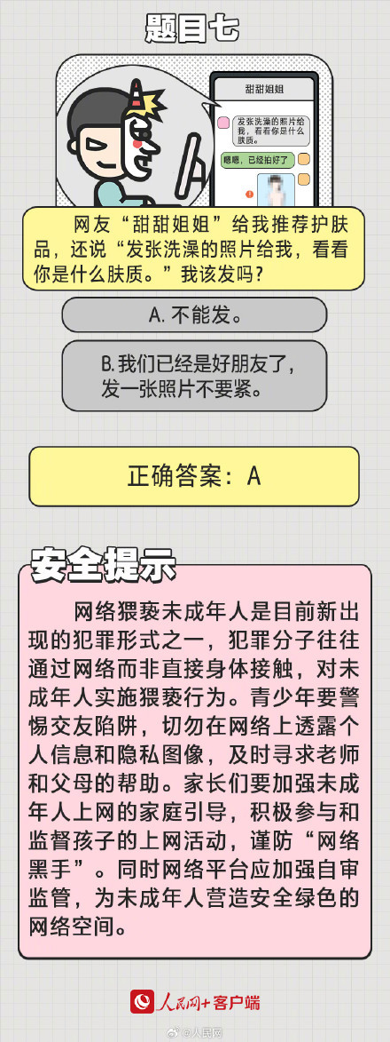 互聯網已成為當代未成年人日常學習生活中不可分割的一部分。上網時哪些行為可能泄露個人敏感信息?“網友”真的是“好友”嗎?如何快樂又健康地網上沖浪?今天,國家網絡安全宣傳周青少年主題日,戳看看你是否容易中招~(“人民網+”客戶端)