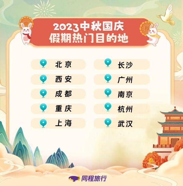 同程旅行數據顯示,北京、西安、成都、重慶、上海、長沙、廣州、南京、杭州、武漢是中秋國慶假期熱度最高的國內旅游目的地城市。除了便利的交通條件和豐富的旅游資源外,這些城市文化底蘊深厚,以及在中秋國慶期間推出眾多傳統文化相關的節日活動,吸引了大量游客前往。