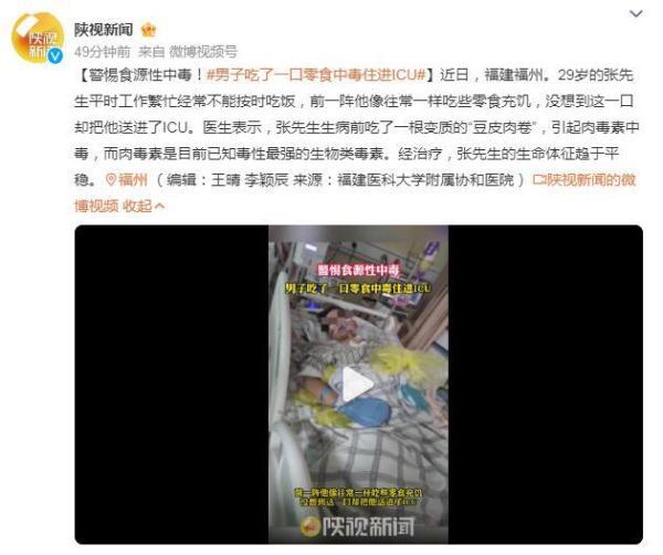近日,福建福州。29歲的張先生平時工作繁忙經常不能按時吃飯,前一陣他像往常一樣吃些零食充饑,沒想到這一口卻把他送進了ICU。醫生表示,張先生生病前吃了一根變質的“豆皮肉卷”,引起肉毒素中毒,而肉毒素是目前已知毒性最強的生物類毒素。經治療,張先生的生命體征趨于平穩。
