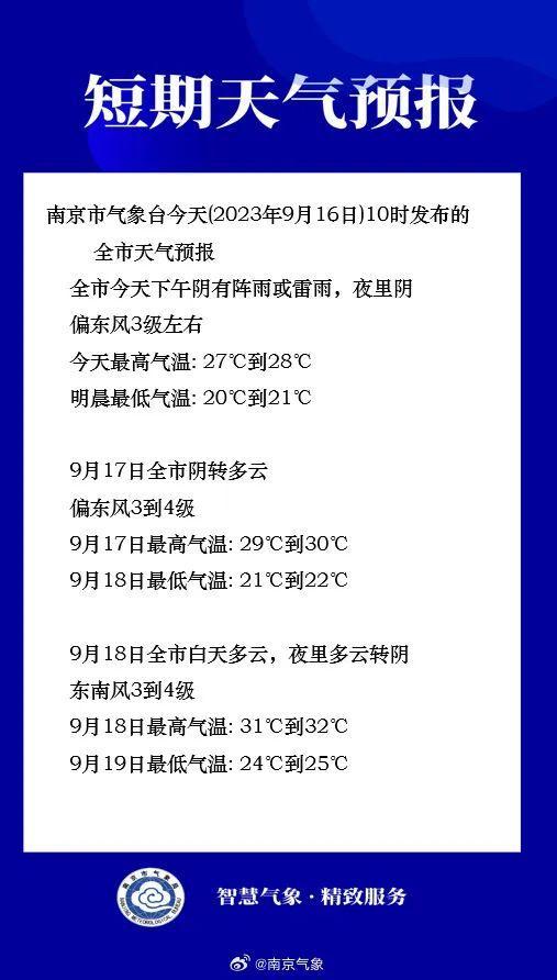 最高溫度:本省東部地區25~26℃,其他地區27~28℃;最低溫度:淮北地區18℃左右,其他地區19~20℃。全省偏東風4級左右,有雷雨地區雷雨時短時陣風7—9級。