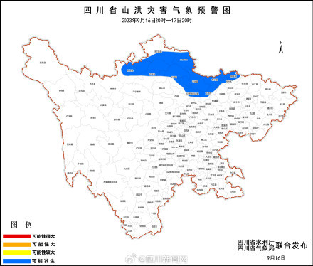 9月16日,四川省水利廳聯合四川省氣象局聯合發布山洪災害藍色預警,2023年9月16日20時至17日20時,廣元市利州、朝天、青川,綿陽市北川、平武、江油,阿壩州松潘、九寨溝、阿壩、若爾蓋、紅原等11個縣(市、區)可能發生山洪災害。
