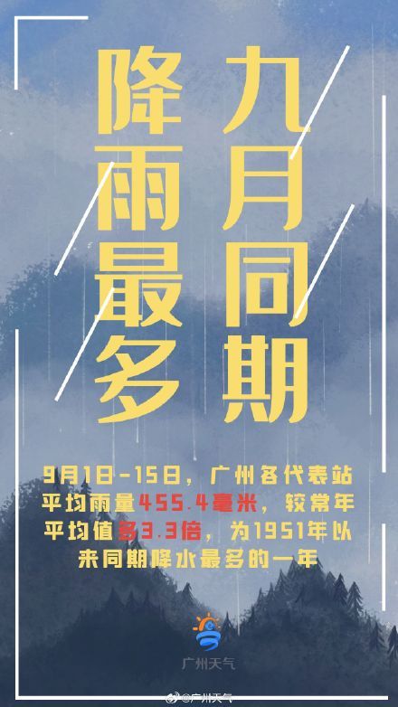 9月1日-15日,廣州各代表站點平均雨量為455.4毫米,比常年均值*多出330%,成為1951年以來歷史同期最多降雨的年份。 同時,短短15天下的雨,比今年整個龍舟水期間(5.20-6.25)443.3毫米還要多。
